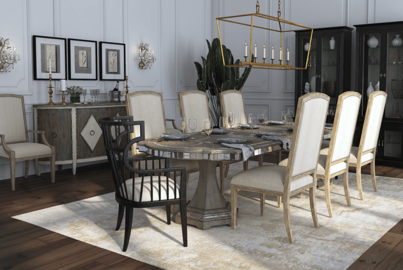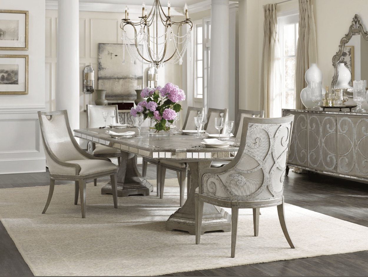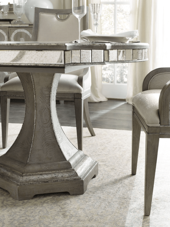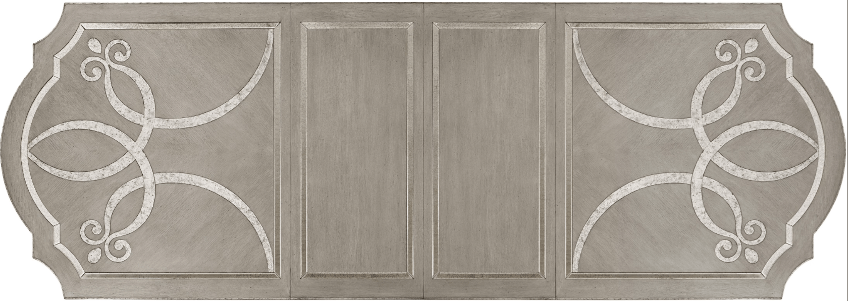 Make every dining gathering a luxe experience with this opulent dining table featuring exquisite scrolled inlays on the top and a mirrored apron. Finished in Epoque, a greige with shimmer on Oak veneers with mirrored accents. Seats 10 guests and extends to 128 inches with both leaves in place. Pursue serenity at home. Create your own personal sanctuary, a special place where you can experience comfort within.