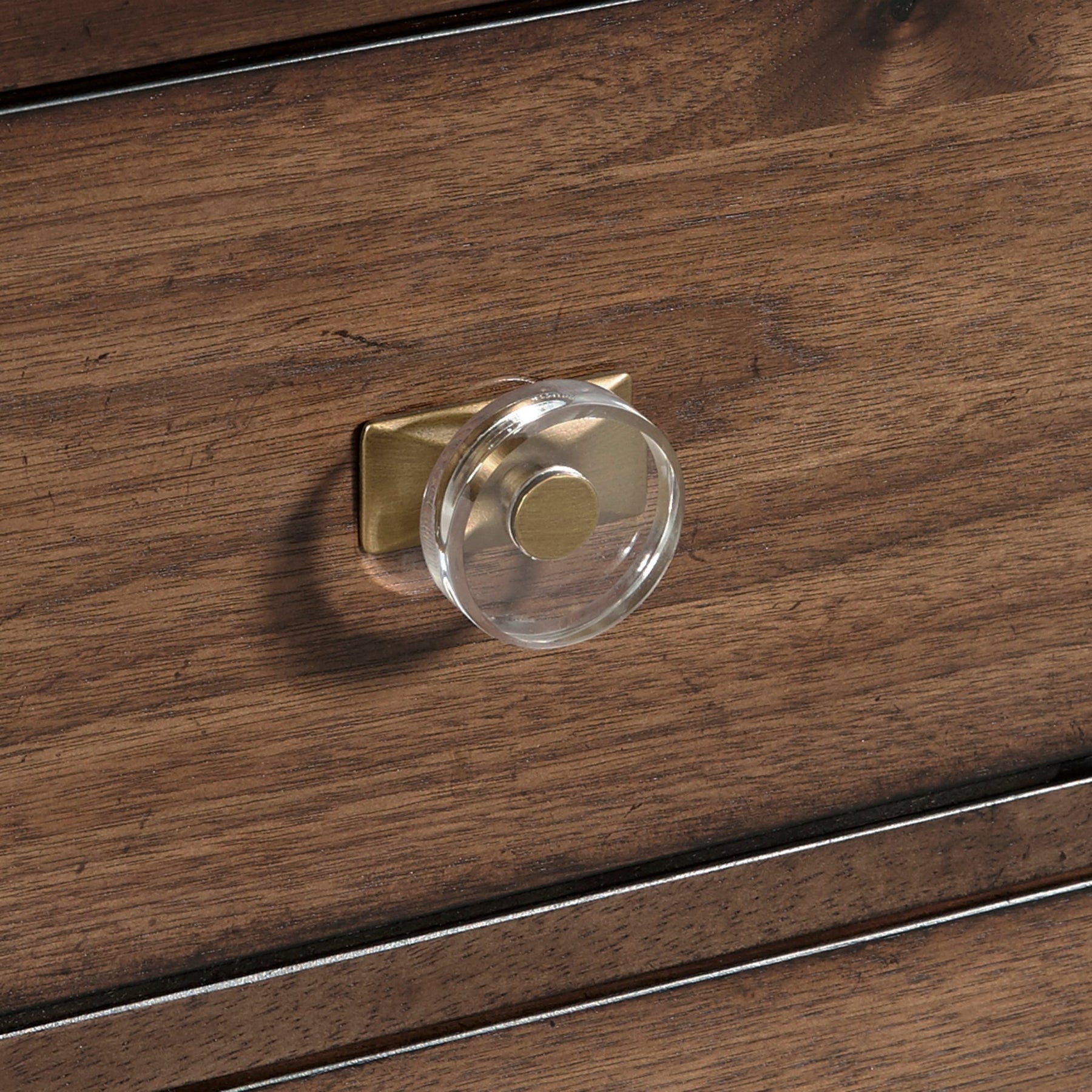 Mid-century modern dresser design offers maximum style with minimalist flair,Base dresser only; optional matching dresser mirror sold separately,Warm brown knotty walnut veneer offers an authentic upscale retro-vintage look,Custom hardware features brushed gold back plates and acrylic pulls for a elegant touch,Crafted with select hardwood, manufactured wood, and knotty walnut veneers for longevity,Some assembly necessary if adding the optional matching dresser mirror, sold separately