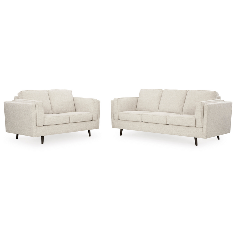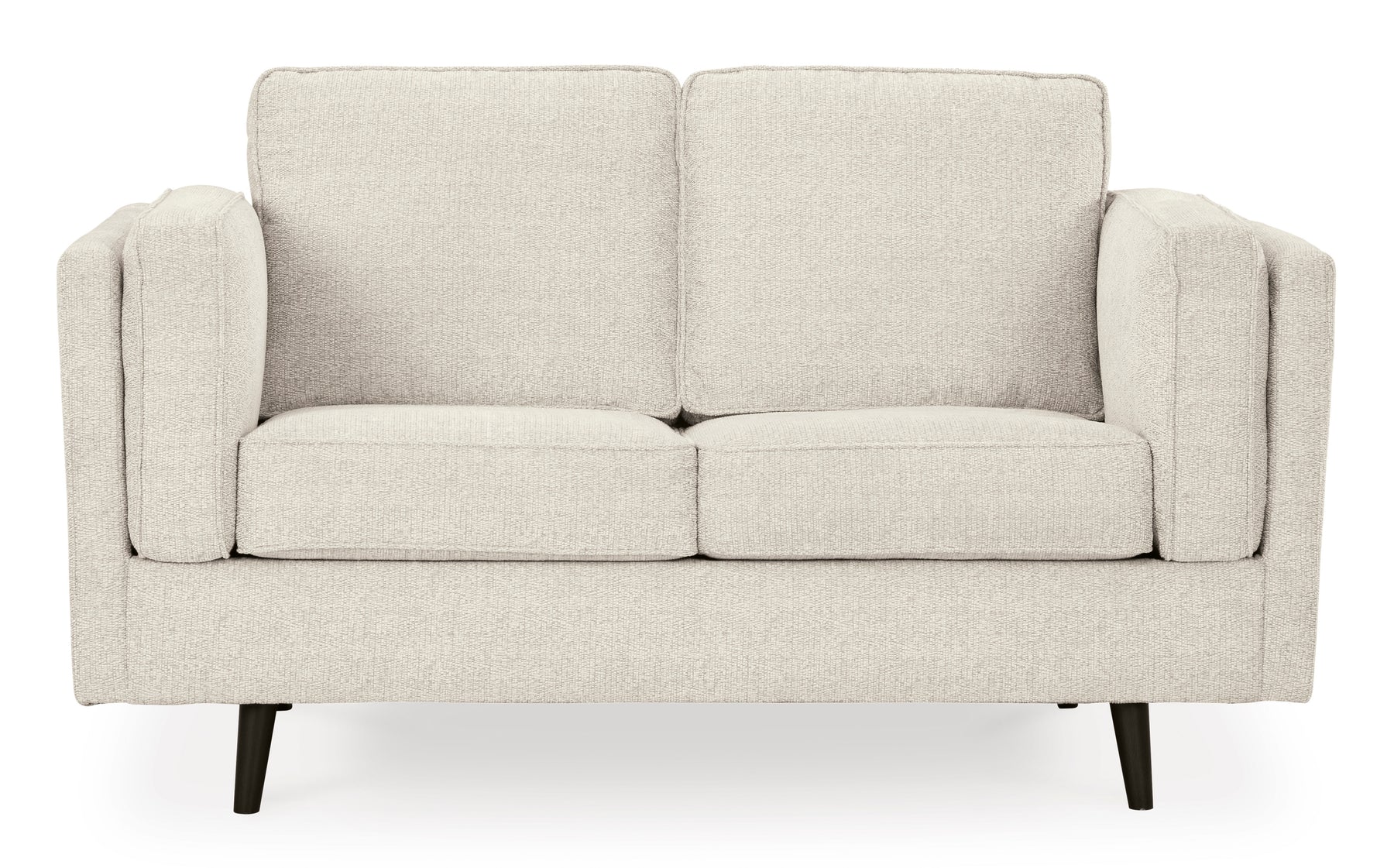 The Maimz loveseat is mid-century revival done to perfection. Linear and minimalistic, the beautifully edited profile has all the retro elements you love, like sheltering arms, bolster pillows and tapered splayed legs. So casually cool, the crisp fabric upholstery brings the look right into the present.