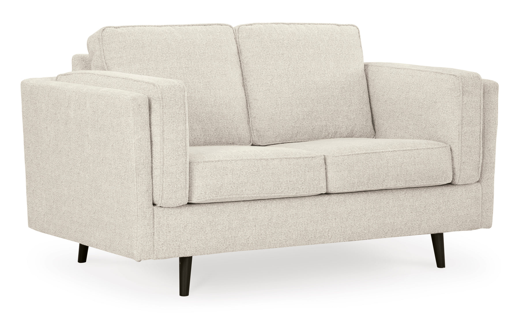 The Maimz loveseat is mid-century revival done to perfection. Linear and minimalistic, the beautifully edited profile has all the retro elements you love, like sheltering arms, bolster pillows and tapered splayed legs. So casually cool, the crisp fabric upholstery brings the look right into the present.