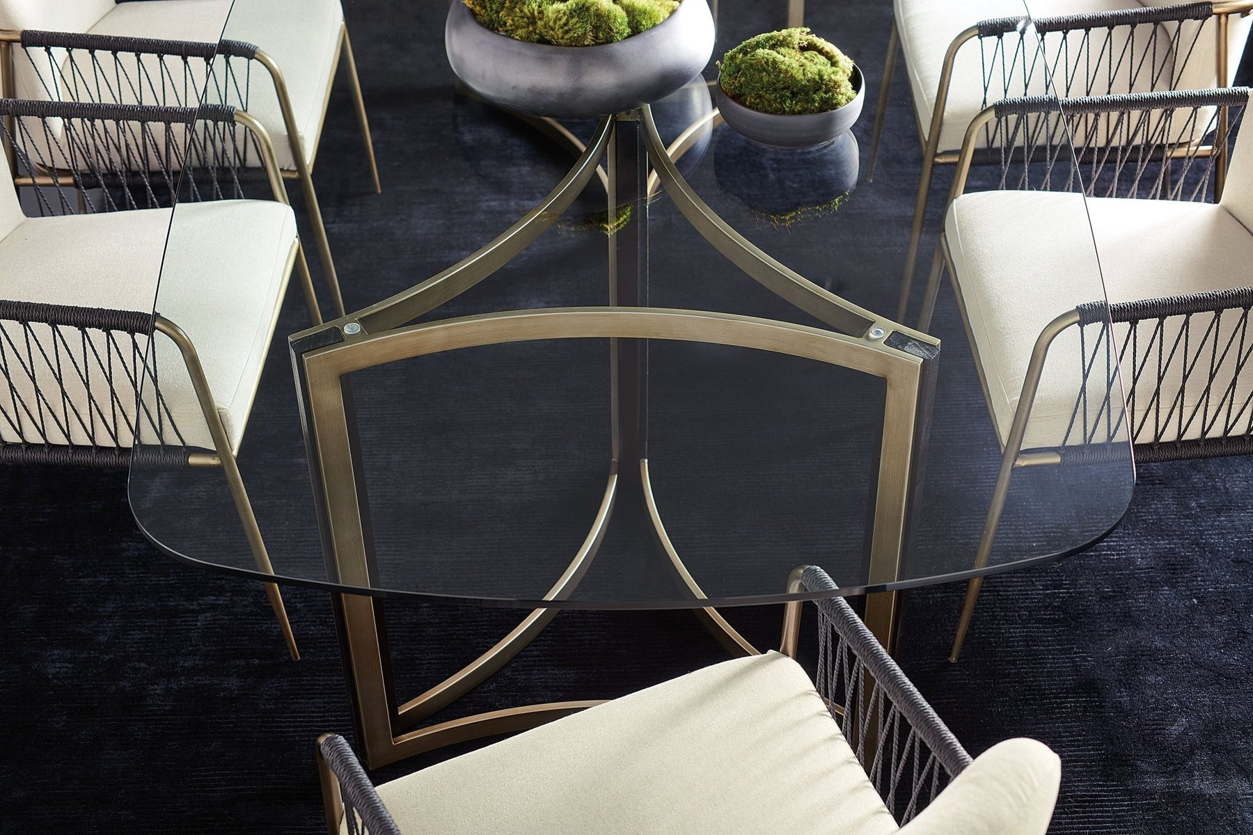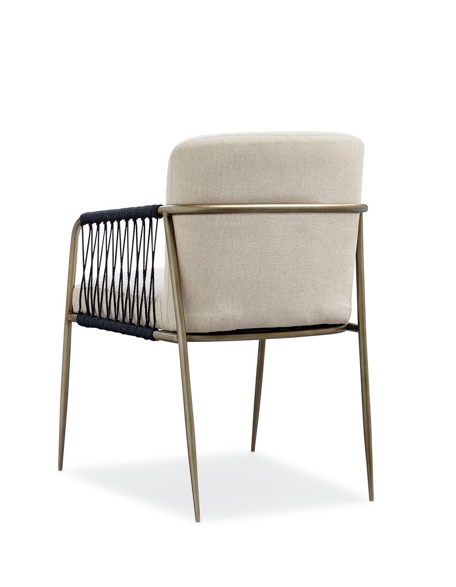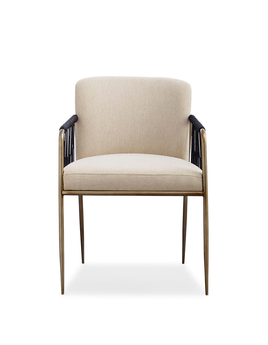 Mixing old and new, this remarkable chair is a visual expression of the best of both worlds. Its classic form is updated in luxe materials and intriguing textures to create a must-have piece for today’s well-dressed dining room. The chair’s metal frame wears a Bronzed Metal finish while elegantly woven black cording highlights the open space alongside each arm. An upholstered seat and seat back in an elegant neutral create a place ideally suited for hours of comfortable sitting and entertaining.