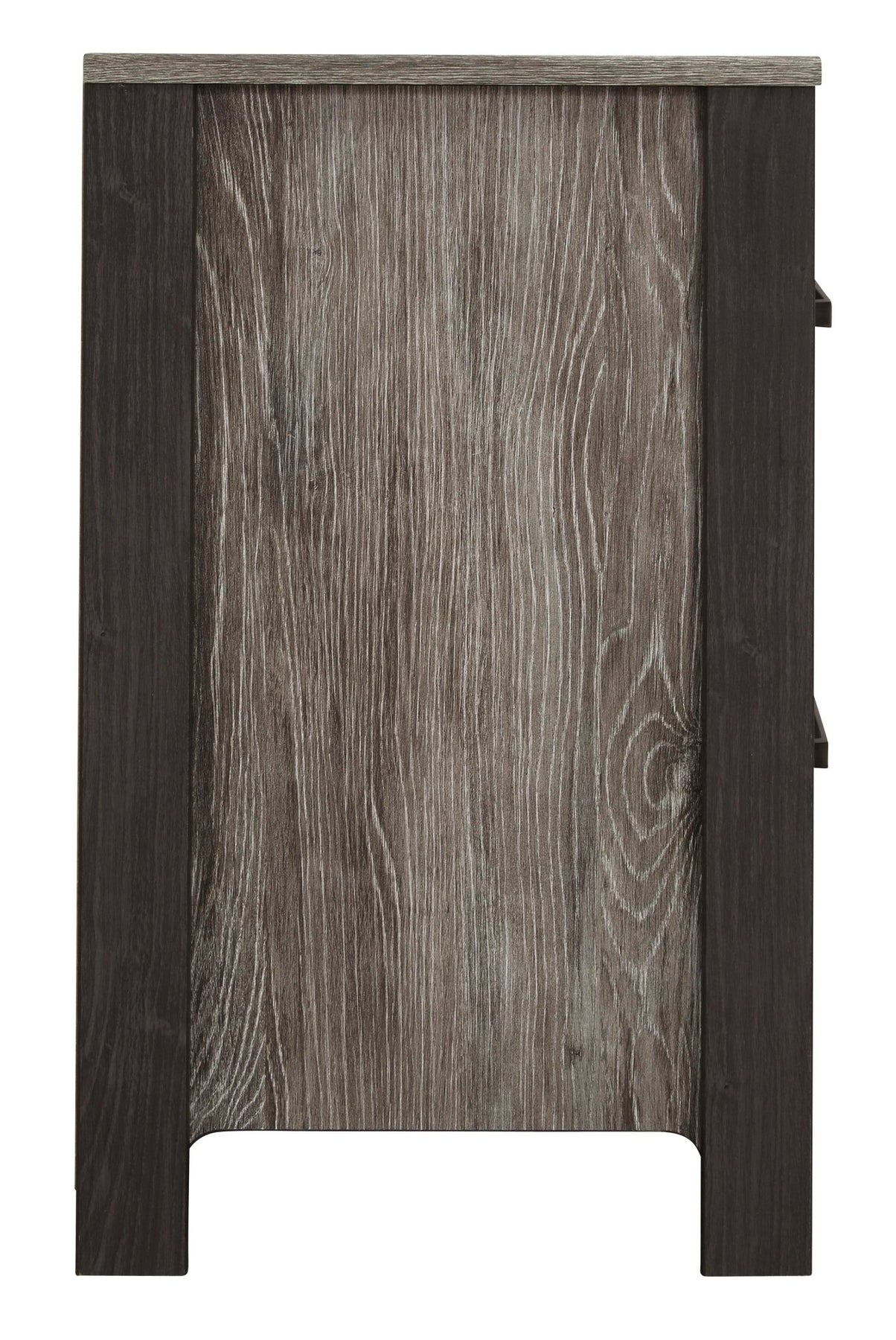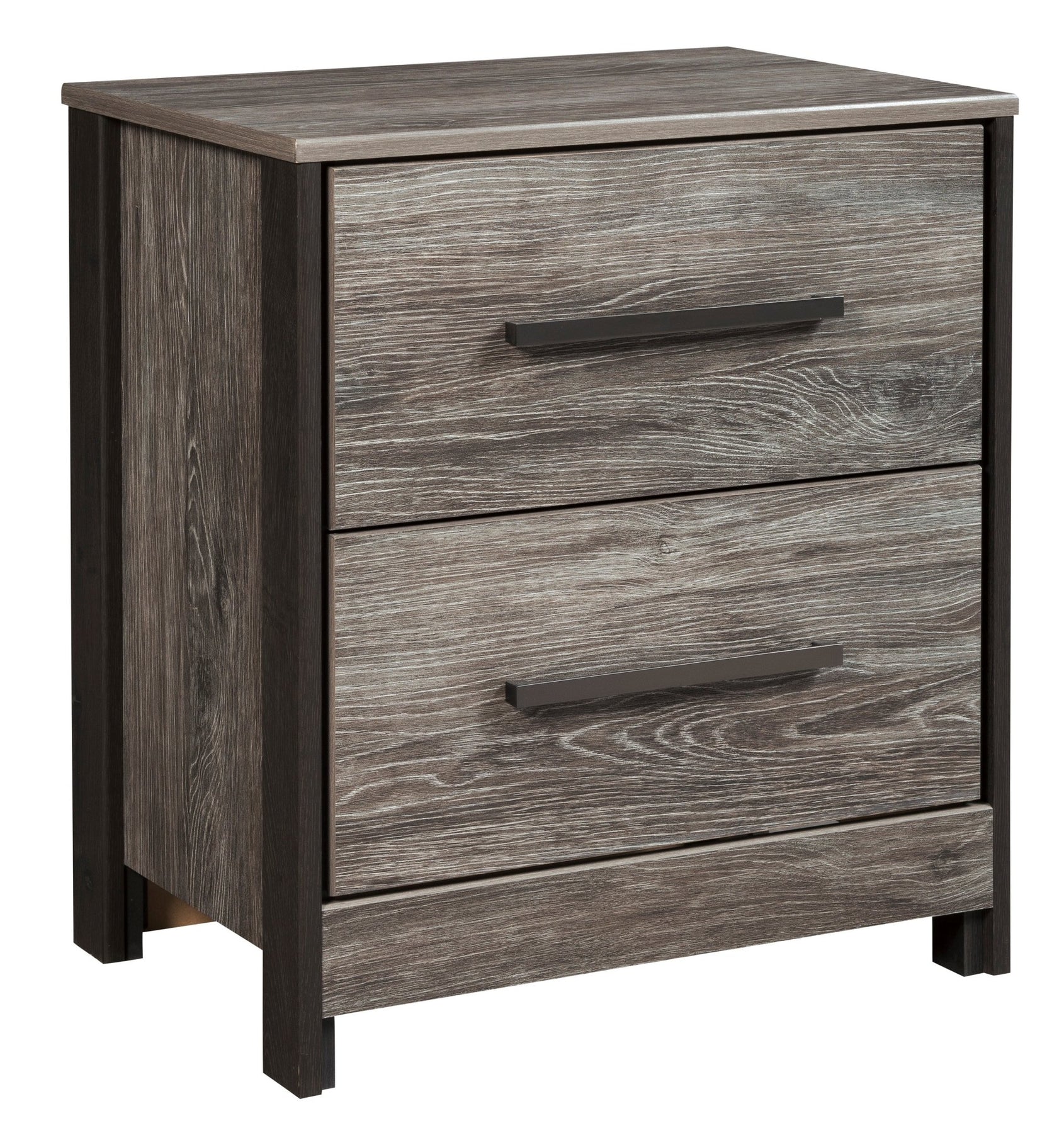Made of engineered wood (MDF/particleboard) and decorative laminate;Rustic warm gray finish over replicated oak grain;Frame accented with dark charcoal finish over replicated oak grain;Metal drawer pulls and posts in a dark gunmetal finish;2 smooth-gliding drawers lined with faux linen laminate for a finished look;2 slim-profile USB charging stations;Power cord included; UL Listed;Assembly required