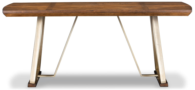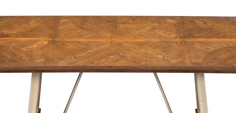 Pacific View collection is rich in refined details. Its wooden body is finished in rich brown tones that highlight the grain of the wood. The front legs end in golden metal tips; the same metal insert adorns the back of the back. The soft seat and back are upholstered in neutral gray fabric.