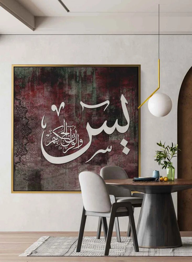 Square Canvas Wall Art Stretched Over Wooden Frame with Black Floating Frame and Islamic Quran Surah Yaseen Painting