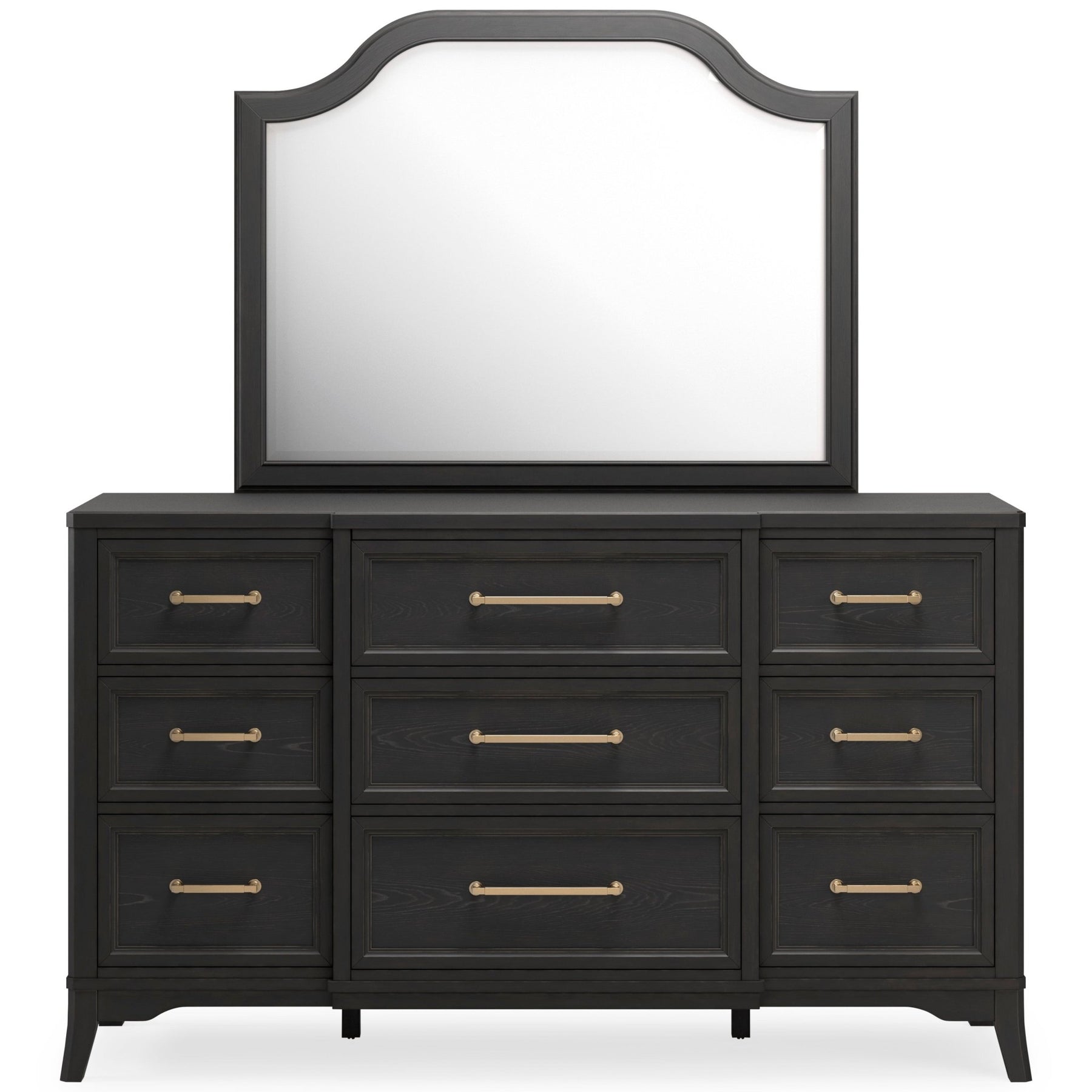 Dresser only;Made with hardwood solids, oak veneer and MDF substrate;Layered black finish on textured wood grain surface;Goldtone finish on drawer handles;9 drawers with fully finished interiors, dovetail construction and ball-bearing side glides (top drawer with felt-lined bottom);Saber legs set with shaped lower aprons