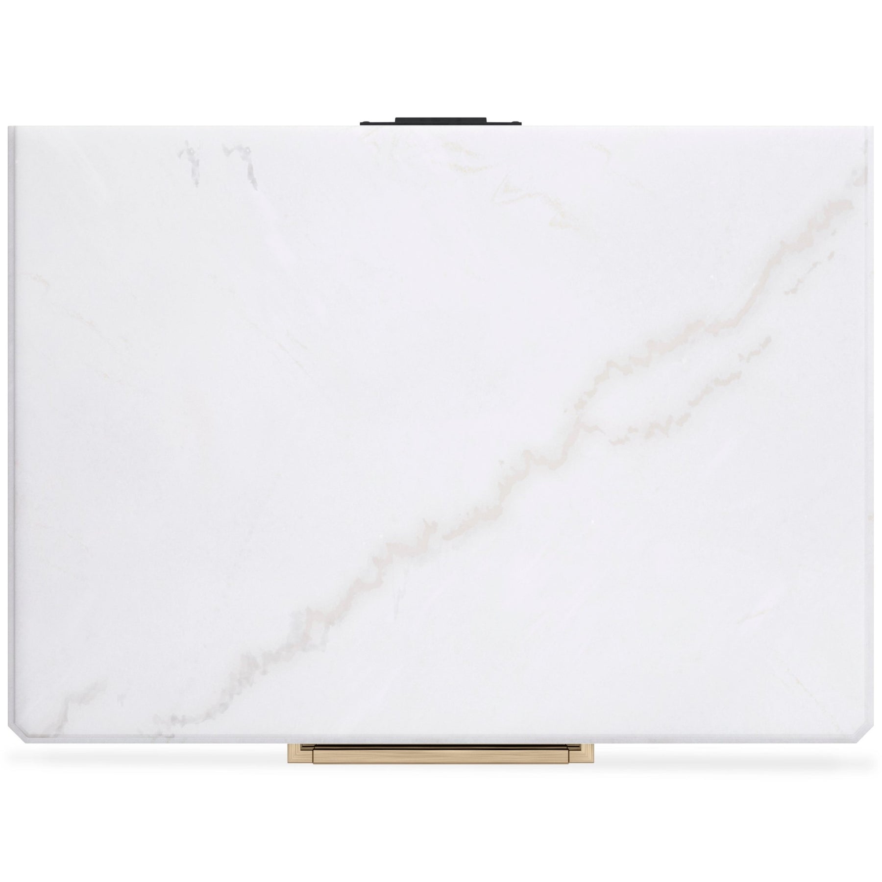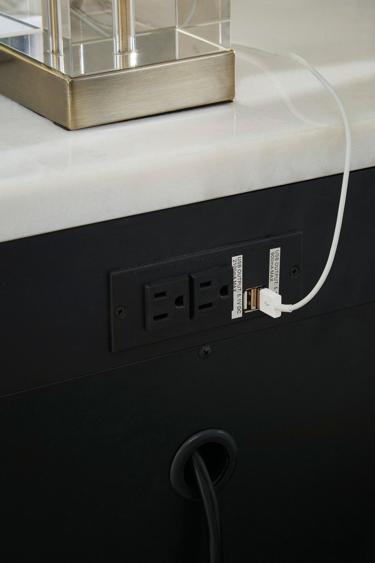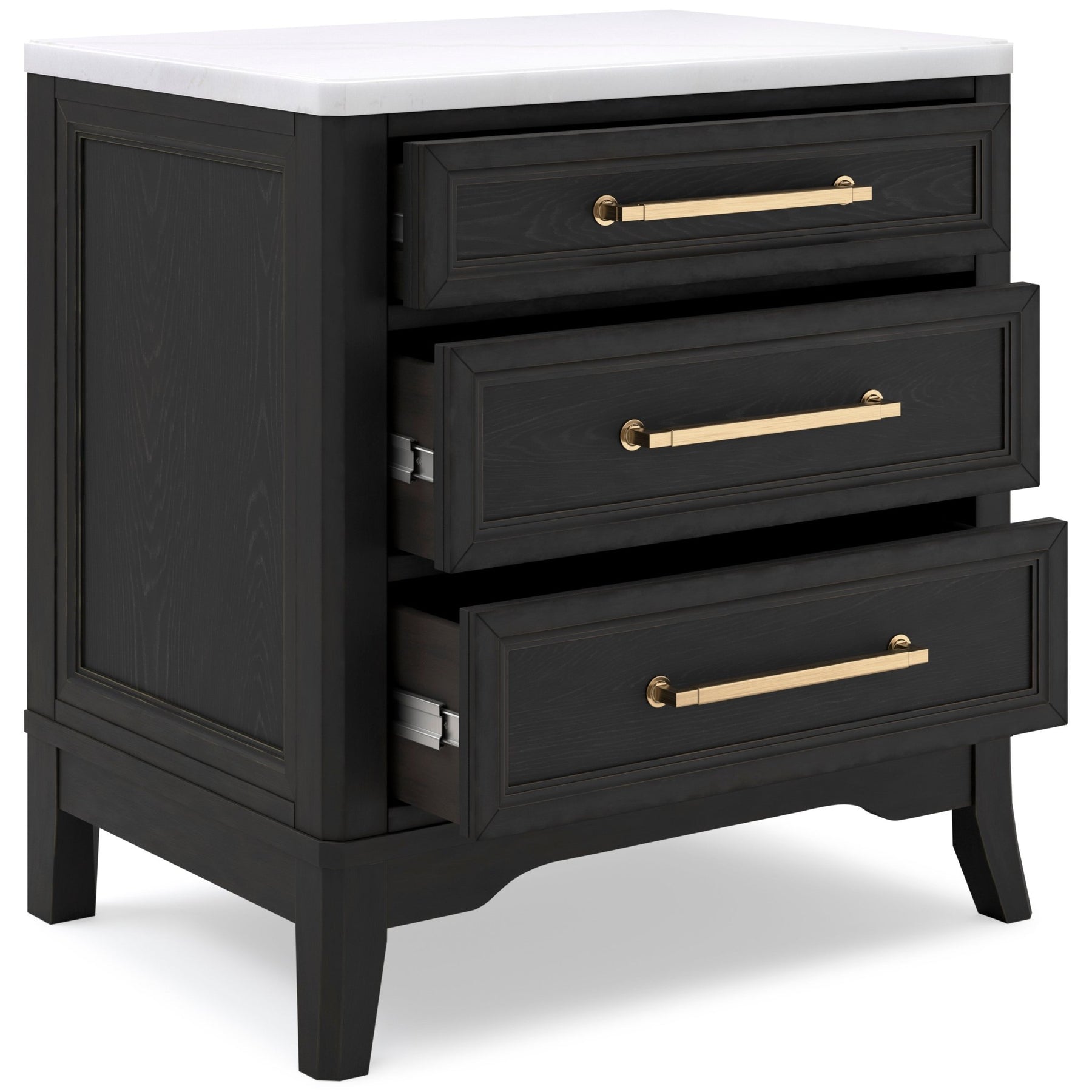 Made with hardwood solids, oak veneer and MDF substrate;Layered black finish on textured wood grain surface;Goldtone finish on drawer handles;3 drawers with fully finished interiors, dovetail construction and ball-bearing side glides (top drawer with felt-lined bottom);Natural white marble top;Saber legs set with shaped lower aprons;110V power supply with dual USB charging ports;Power cord included; UL Listed