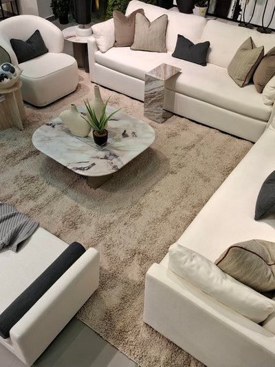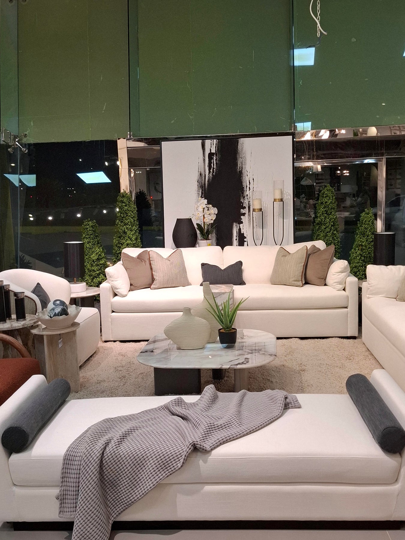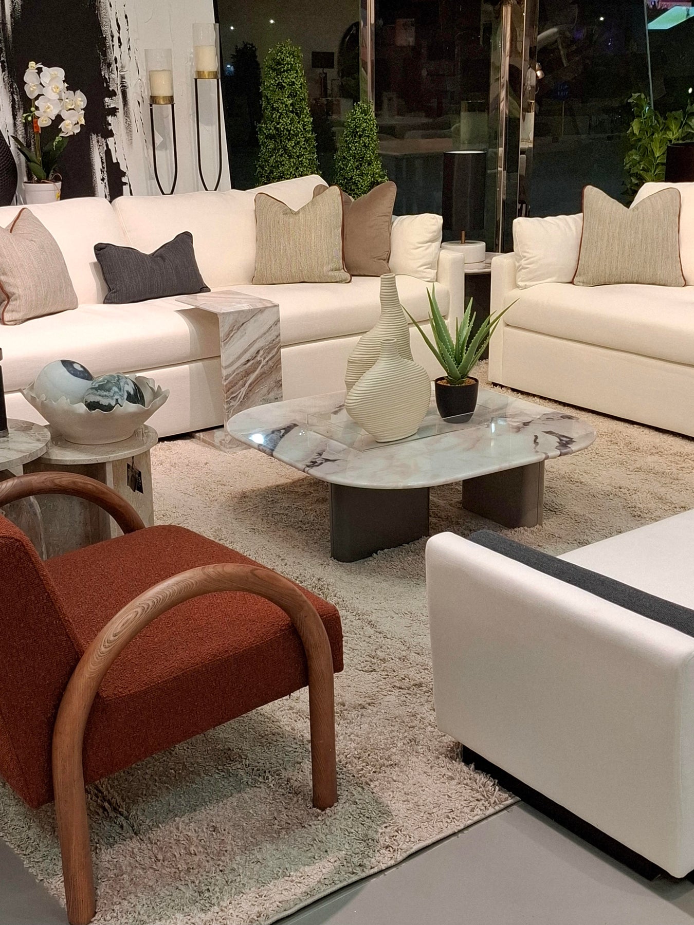 Yashki Living Room Set by Roots Furniture made to impress and provide comfort. Designed by the Influencer Yasmin Alkhawashki, this posh beige set with blue accents adds a unique style to any living room.